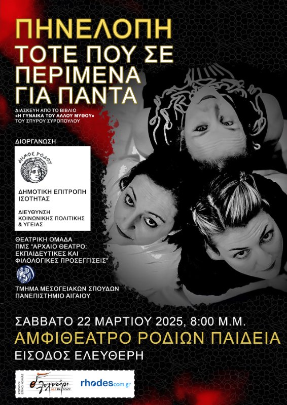 θεατρική παράσταση «Πηνελόπη: τότε που σε περίμενα για πάντα» το Σάββατο 22 Μαρτίου 2025 στο Αμφιθέατρο του «Ροδίων Παιδεία» στις 8:00μ.μ. με ελεύθερη είσοδο.