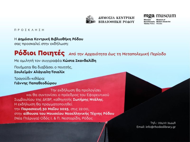 Νεοελληνικής Τέχνης Ρόδου (Πλατεία Γ. Χαρίτου) στις 19:30.