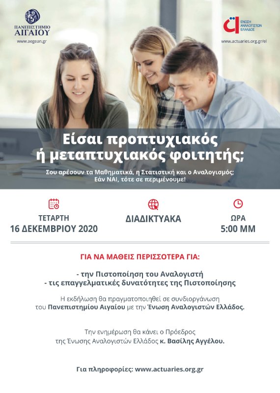 Το Πανεπιστήμιο Αιγαίου και η Ένωση Αναλογιστών Ελλάδος σας προσκαλούν στη Διαδικτυακή Ενημέρωση που θα πραγματοποιηθεί