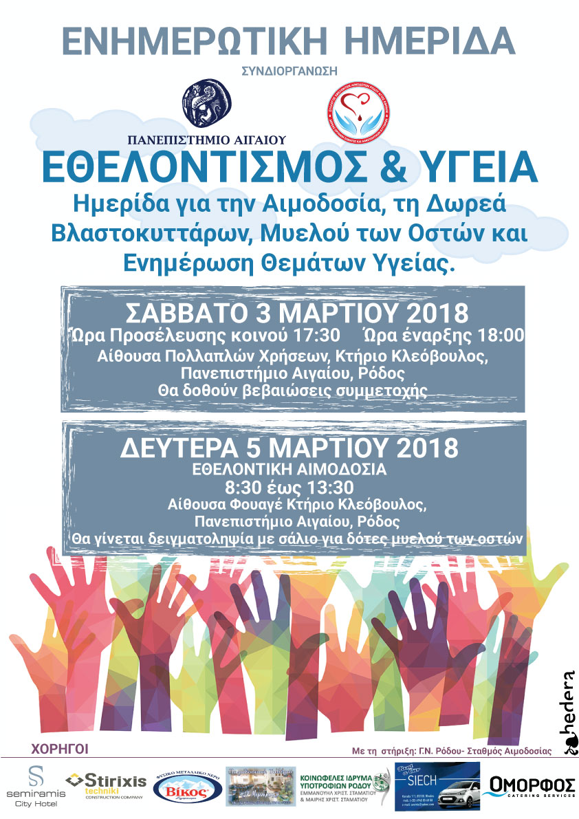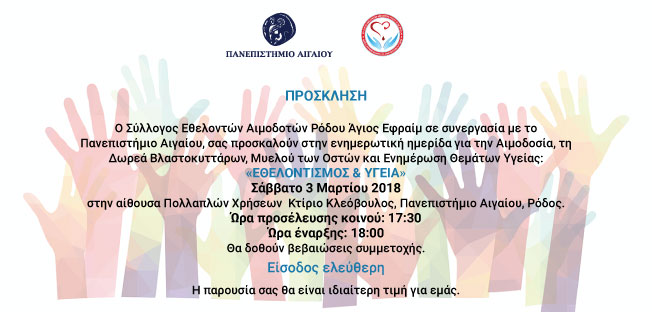 Το Πανεπιστήμιο Αιγαίου σε συνεργασία με τον Σύλλογο Εθελοντών Αιμοδοτών Ρόδου «Άγιος Εφραίμ» οργανώνουν Ενημερωτική Ημερίδα με θέμα «Εθελοντισμός & Υγεία: Ημερίδα για την Αιμοδοσία, τη Δωρεά Βλαστοκυττάρων, Μυελού των Οστών και Ενημέρωση Θεμάτων Υγείας», το Σάββατο 3 Μαρτίου στην αίθουσα Πολλαπλών Χρήσεων του Πανεπιστημίου Αιγαίου στις 18:00.