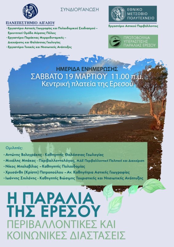 Η Ημερίδα συνδιοργανώνεται από την Πρωτοβουλία Υπεράσπισης Παραλίας Ερεσού, το Εργαστήριο Αστικού Περιβάλλοντος του ΕΜΠ και τα παρακάτω εργαστήρια του Πανεπιστημίου Αιγαίου: