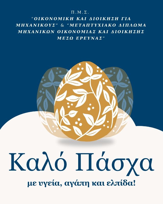 Ο Διευθυντής των Π.Μ.Σ. “Οικονομική και Διοίκηση για Μηχανικούς” και “Μεταπτυχιακό Δίπλωμα Μηχανικών Οικονομίας και Διοίκησης μέσω Έρευνας” Καθηγητής Αγάπιος Πλατής, το διδακτικό και διοικητικό προσωπικό, σας εύχονται Καλό Πάσχα με υγεία, αγάπη και ελπίδα!