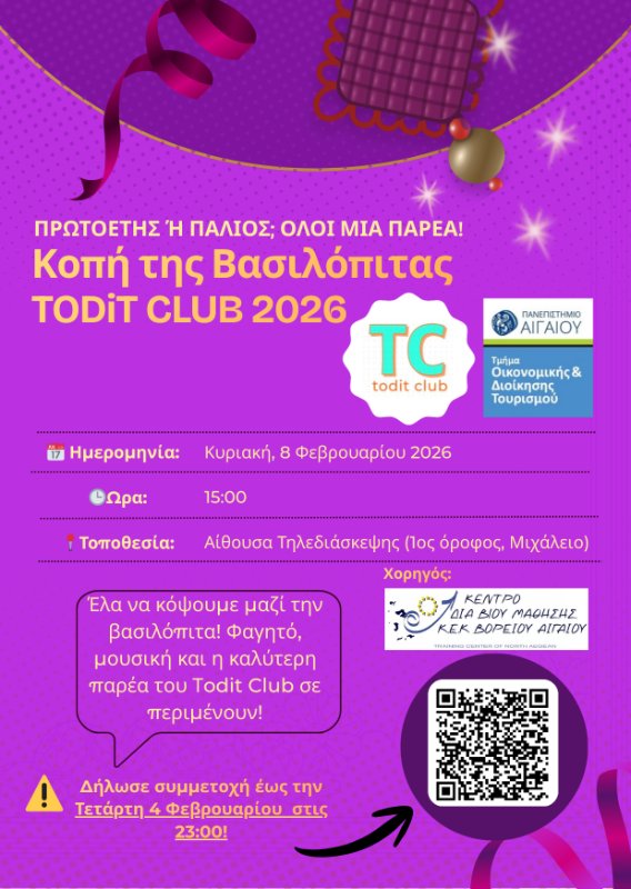 Το Todit Club σας προσκαλεί στην ετήσια κοπή της Βασιλόπιτας την Κυριακή 08 Φεβρουαρίου και ώρα 15:00, στην Αίθουσα Τηλεδιάσκεψης Ορόφου στο Μιχάλειο κτίριο.