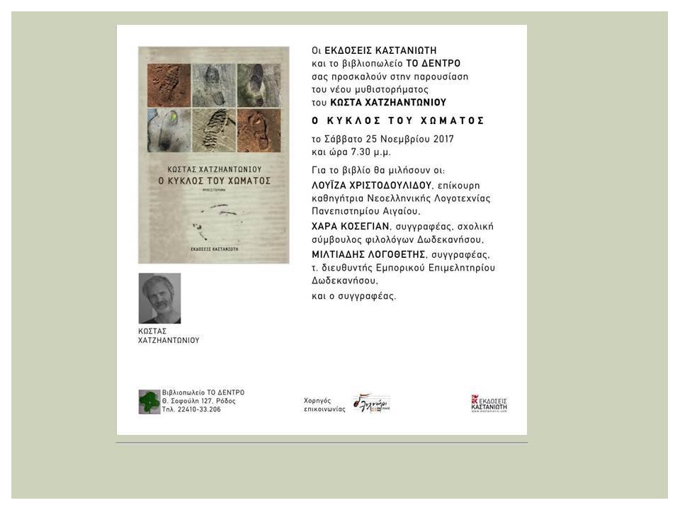 Οι εκδόσεις ΚΑΣΤΑΝΙΩΤΗ και το βιβλιοπωλείο ΤΟ ΔΕΝΤΡΟ σας προσκαλούν στην παρουσίαση του νέου μυθιστορήματος του ΚΩΣΤΑ ΧΑΤΖΗΑΝΤΩΝΙΟΥ "Ο ΚΥΚΛΟΣ ΤΟΥ ΧΩΜΑΤΟΣ", το Σάββατο 25 Νοεμβρίου και ώρα 19:30.