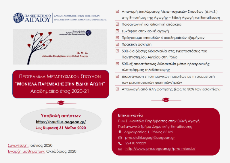 - στη Γραμματεία του Π.Μ.Σ. «Μοντέλα Παρέμβασης στην Ειδική Αγωγή» στο e-mail pms.eidiki.agogi(at)aegean.gr