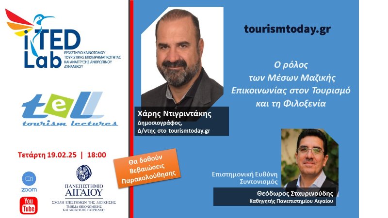 Το iTED Lab του Τμήματος Οικονομικής και Διοίκησης Τουρισμού του Πανεπιστημίου Αιγαίου συνεχίζοντας τη σειρά διαλέξεων "TeL - Tourism e-Lectures" από επιλεγμένα στελέχη και επαγγελματίες του τουριστικού κλάδου, έχει την τιμή και τη χαρά να φιλοξενεί διαδικτυακά τον κ. Χάρη Ντιγριντάκη, Δημοσιογράφο στον Ελεύθερο Τύπο, Διευθυντή στο Tourismtoday.gr και Ραδιοφωνικό Παραγωγό στο Talk Radio 98,9.